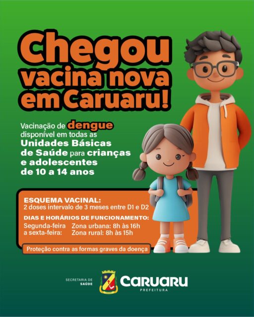 A Prefeitura de Caruaru, por meio da Secretaria Municipal de Saúde, iniciou, nesta segunda-feira (09), a vacinação contra a dengue no município para crianças e adolescentes de 10 a 14 anos, conforme ampliação da estratégia definida pelo Ministério da Saúde. A imunização ocorre nas Unidades Básicas de Saúde, com horário das 8h às 16h na zona urbana e das 8h às 15h na zona rural, fortalecendo a prevenção e reduzindo o risco de casos graves da doença.