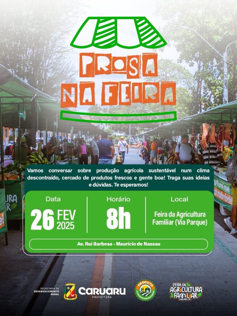 A Prefeitura de Caruaru realiza, na próxima quinta-feira (26), às 8h, a primeira edição do Prosa na Feira – Agroecologia, na Feira da Agricultura Familiar da Via Parque. O evento, promovido pela Secretaria de Desenvolvimento Rural (SDR), fortalece a agricultura familiar e incentiva práticas sustentáveis no município.